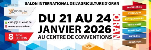 La huitième édition du Salon international de l’agriculture d’Oran (Agri Pro Expo 2026) se tiendra au Centre des conférences « Mohamed Benahmed » d’Oran du 21 au 24 janvier courant, a-t-on appris, jeudi, auprès des organisateurs.