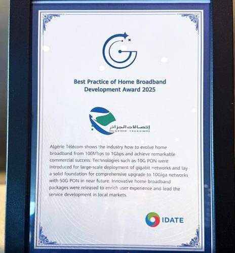 Le prix a été remis par IDATE au PDG d’Algérie Télécom, Adel Bentoumi, en présence du ministre de la Poste et des Télécommunications, Sid Ali Zerrouki, lors du Forum Green All-Optical Network 2025. Dans une déclaration à la presse, M. Bentoumi a exprimé « sa profonde gratitude et son immense honneur de recevoir ce prix au nom d’Algérie Télécomé. Il a souligné que « cette récompense témoigne de l’engagement d’Algérie Télécom envers un avenir numérique durable, alliant innovation et respect de l’environnement, et reflète notre vision d’un avenir numérique où chaque Algérien a accès à un haut débit de qualité, considéré comme un droit fondamental et un levier essentiel pour le développement économique et social de notre nation ». M. Bentoumi a mis en avant « les efforts continus d’Algérie Télécom pour connecter chaque foyer, chaque entreprise et chaque citoyen aux opportunités infinies offertes par le monde numérique ».